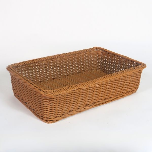 Cesto espositore in vimini sintetico.